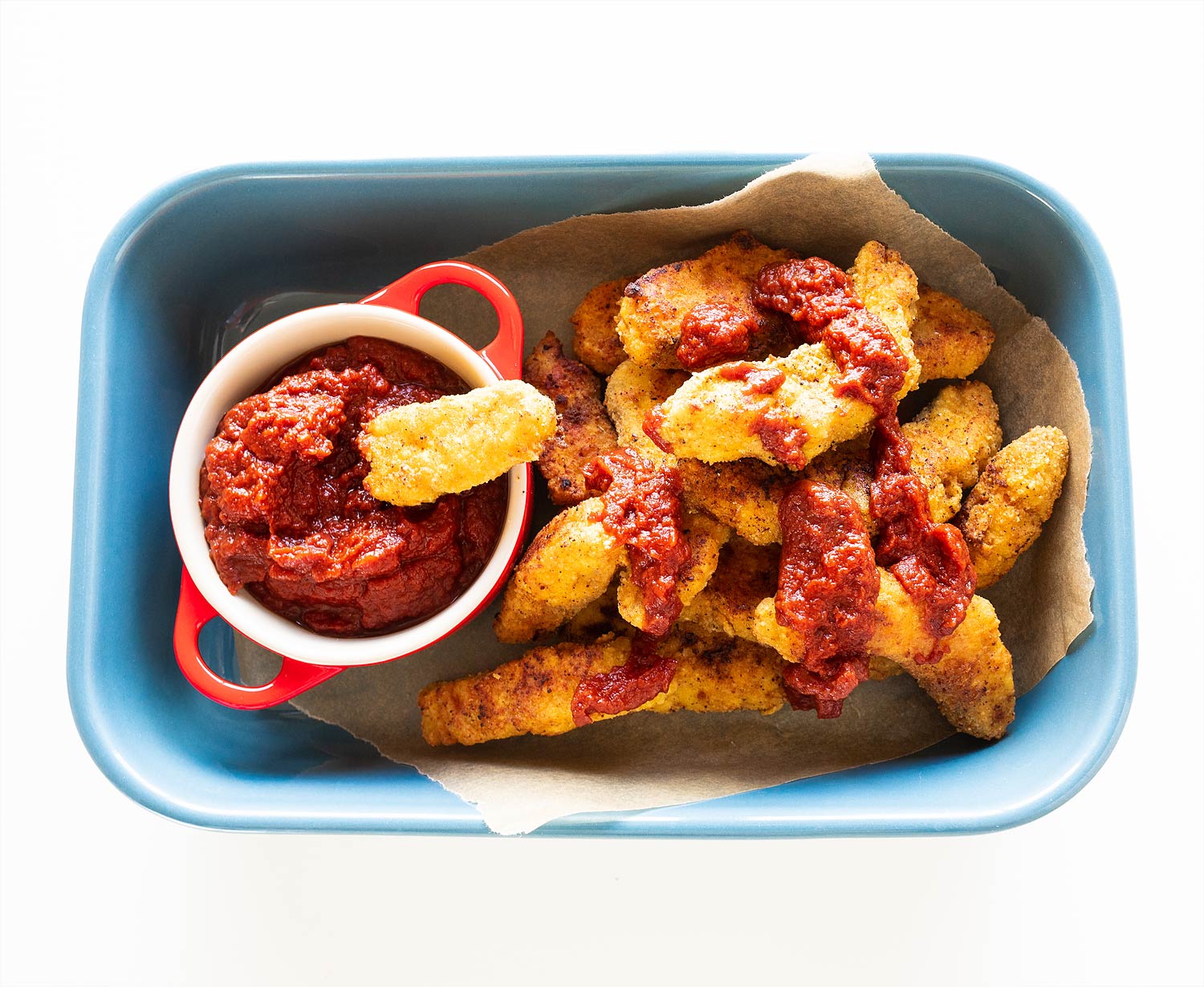Mete las tiras de pescado en el huevo batido y seguidamente en la mezcla del otro bol, asegurándote de que queda con una capa bien uniforme. Ve colocando los palitos sobre una rejilla mientras continúas con el resto.