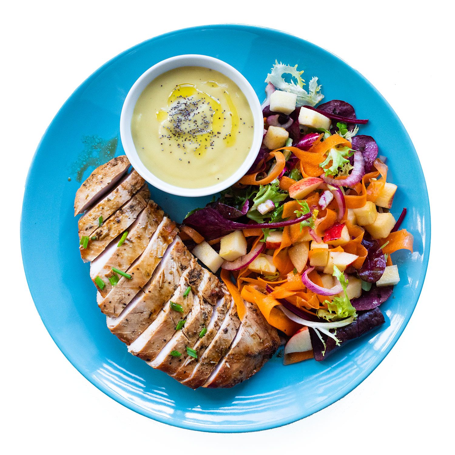 Sirve la pechuga con la ensalada y acompaña con el puré.