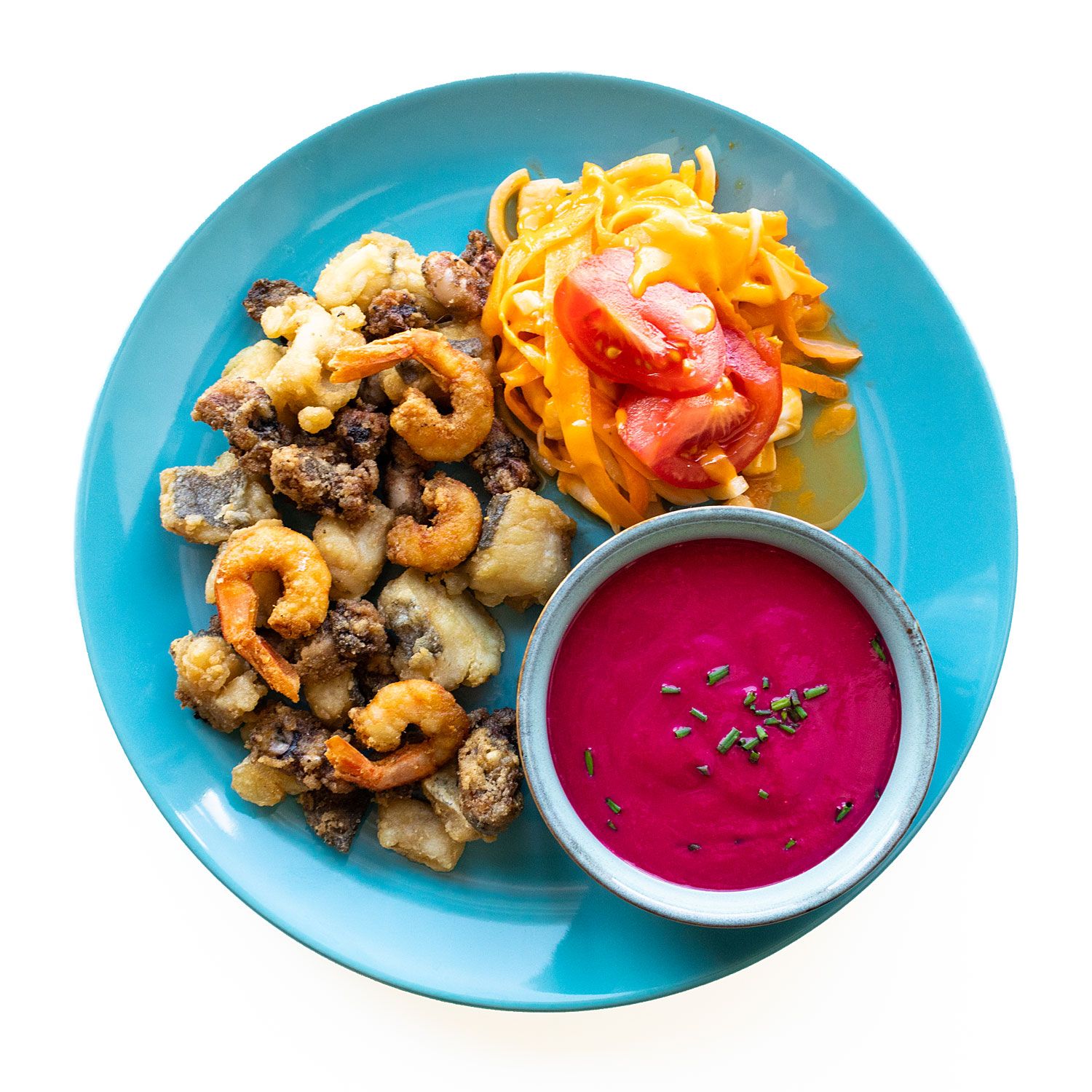 Sirve el pescaíto con la ensalada y acompaña con la sopa.