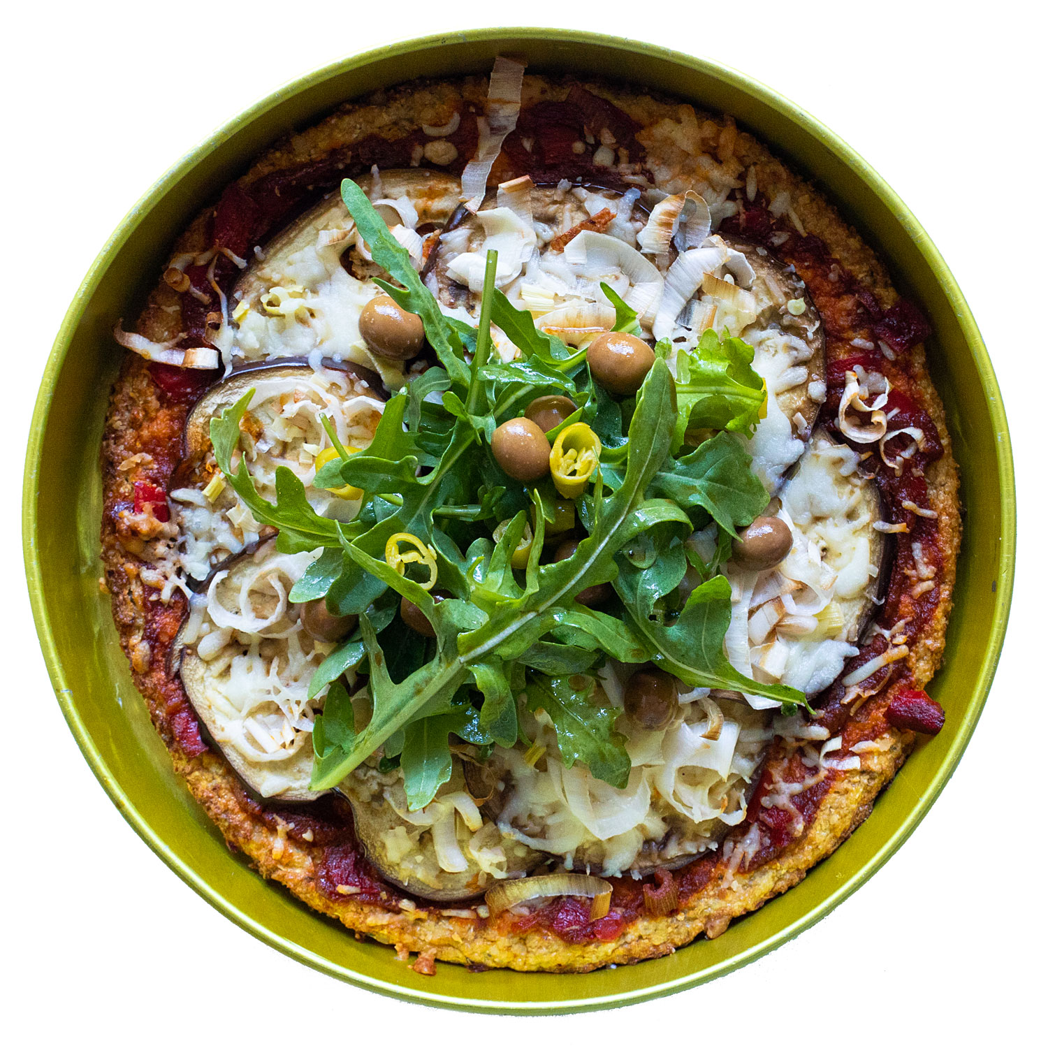 Cubre con el resto de ingredientes (si haces AIP, añade la levadura nutricional cuando la saques del horno) y hornea a media altura durante 12-15 minutos o hasta que se dore un poco. Si lo prefieres, puedes preparar la pizza directamente en el horno sin pasar por la sartén, pero recuerda hornear la masa sin los ingredientes primero.