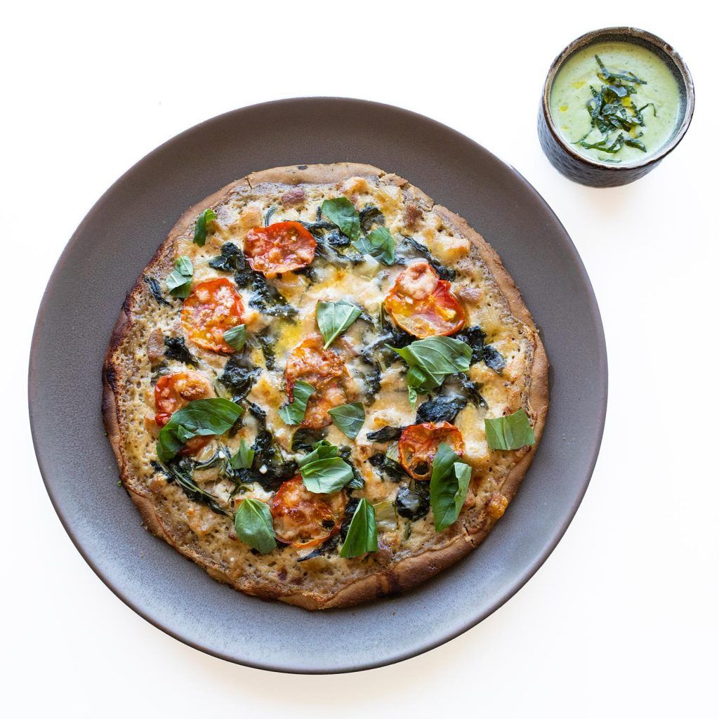 Hornea a media altura durante 12-15 minutos o hasta que la masa haya endurecido. Retira la bandeja del horno y rellena con la salsa carbonara + el tomate + el parmesano. Si quieres, puedes añadir alguna verdura cocida de tu elección (como acelgas o espinacas).