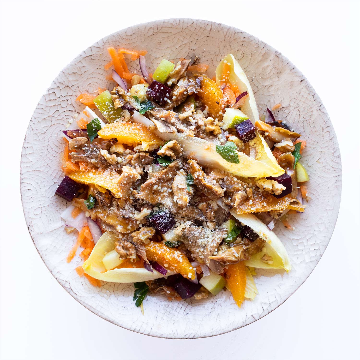 Mezcla todos los ingredientes de la ensalada + el pollo y aliña con la vinagreta.