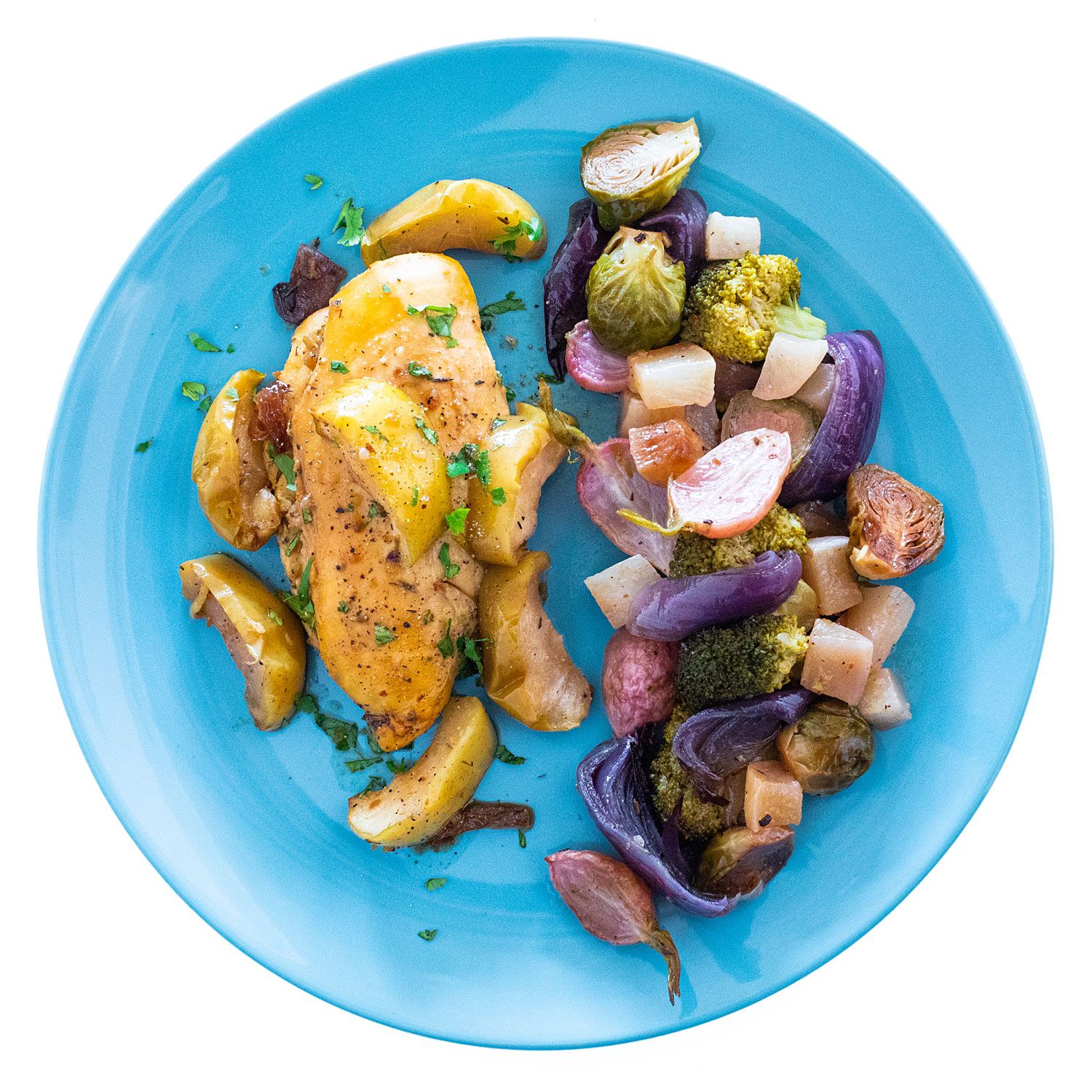 Sirve el pollo con las manzanas y acompaña con las verduras.
