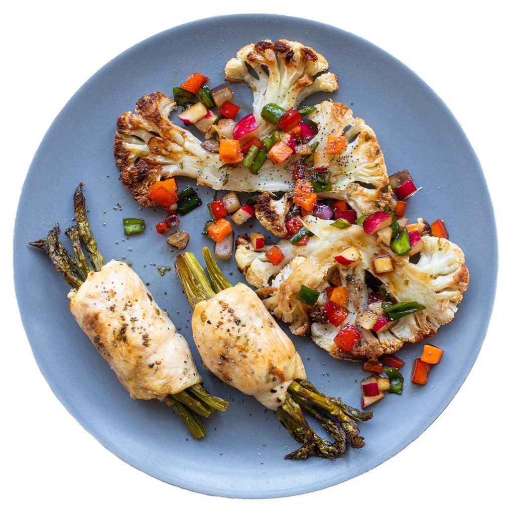 Sirve los rollitos y acompaña con la coliflor + la vinagreta de verduras.