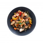 Mezcla todos los ingredientes en una bandeja de horno y remueve hasta integrar. Coloca sin amontonar.