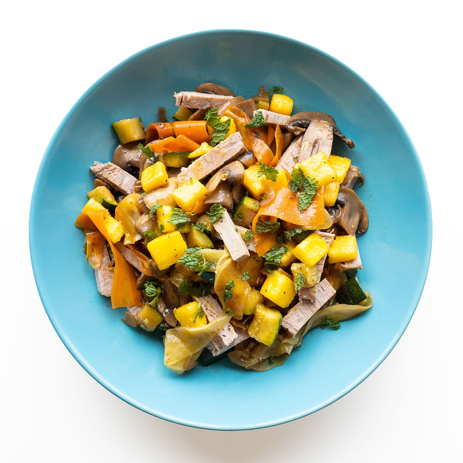 Aliña el mango con el vinagre y sirve sobre el salteado.
