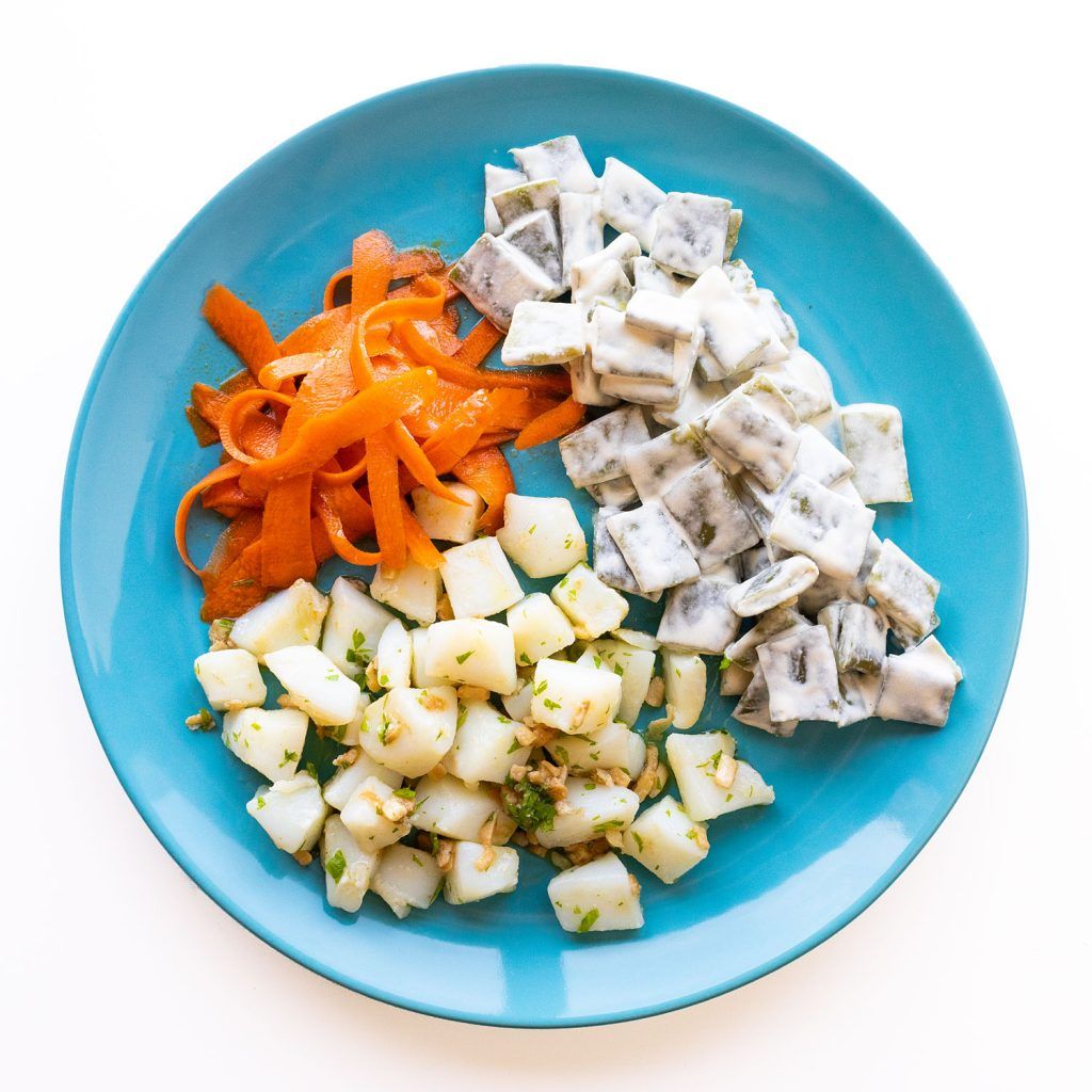 Sirve la sepia acompañada de la zanahoria y las judías con mayonesa.