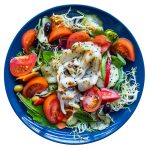 Sirve la sepia sobre la ensalada y decora con las semillas.