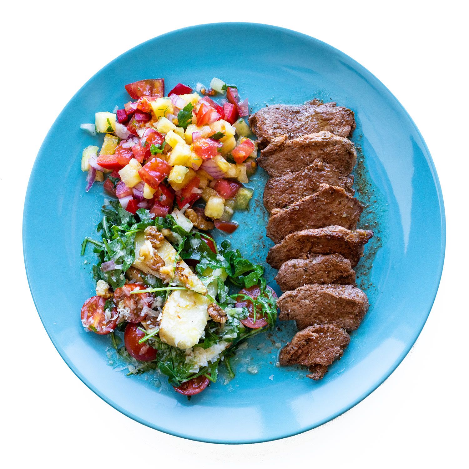 Sirve el solomillo con el pico de gallo y acompaña con la ensalada.