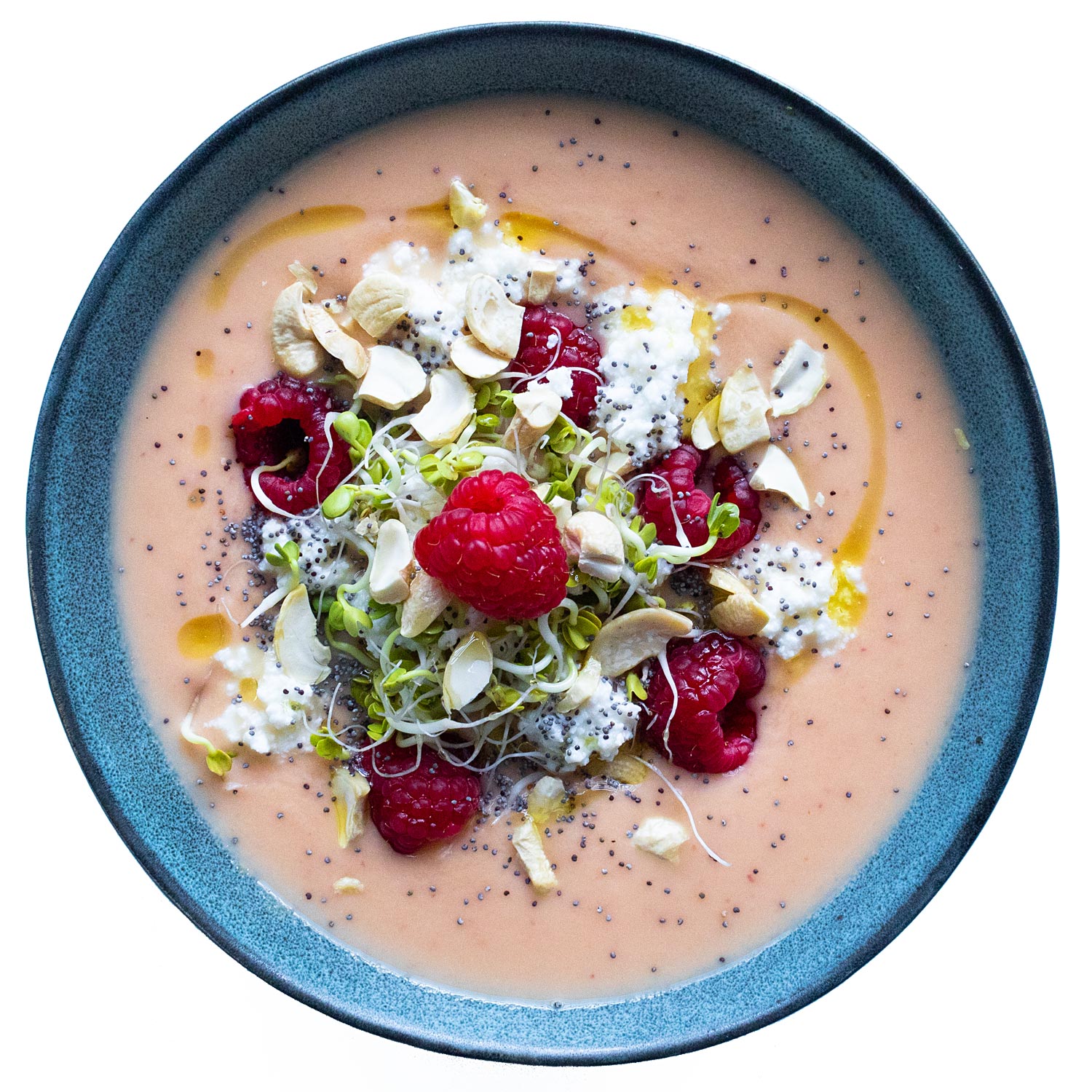 Sirve la sopa en boles y coloca encima el queso + las frambuesas. Si haces AIP, puedes sustituir el requesón por ricotta de coco. Recuerda que tienes la receta disponible en el menú de la semana del 1 al 6 de Junio.
