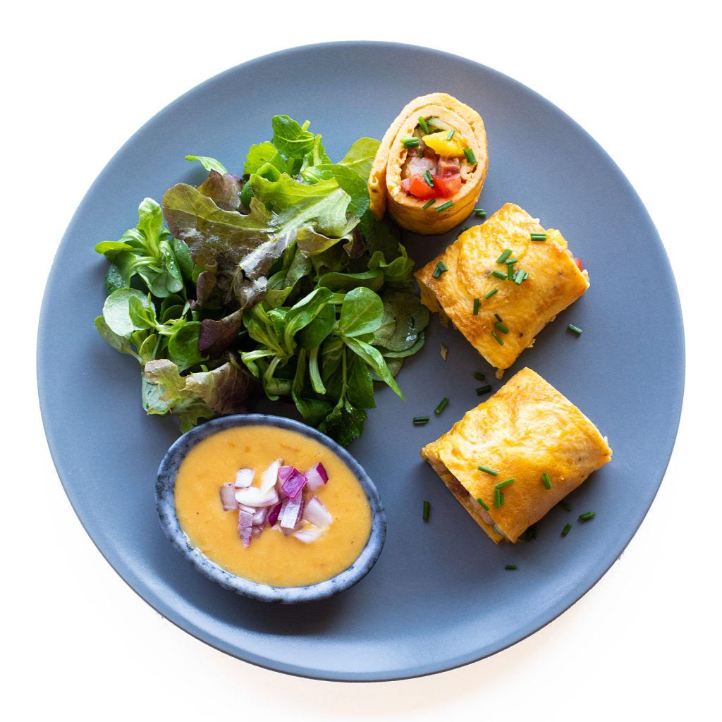 Pon una sartén de unos 28 cm. de diámetro a fuego medio con 1 tsp aceite de oliva. Tendrás que preparar 4 tortillas francesas muy finas para enrollar.
