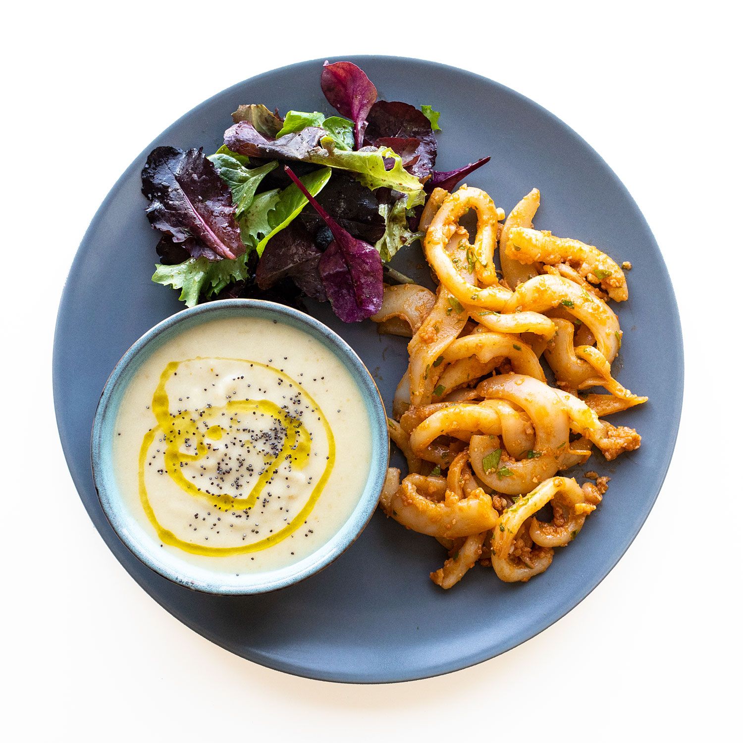 Reparte la vichysoisse fría en 4 boles. Sirve junto a los tallarines y acompaña con el mezclum.