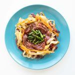 Pon una sartén grande a fuego alto. Cuando esté muy caliente, añade 2 Tbsp aceite de oliva + los entrecot, marca 1 minuto por cada lado y retira. Sumerge en la marinada y asegúrate de que la carne queda impregnada por completo. Guarda en la nevera tapado 4 horas como mínimo.