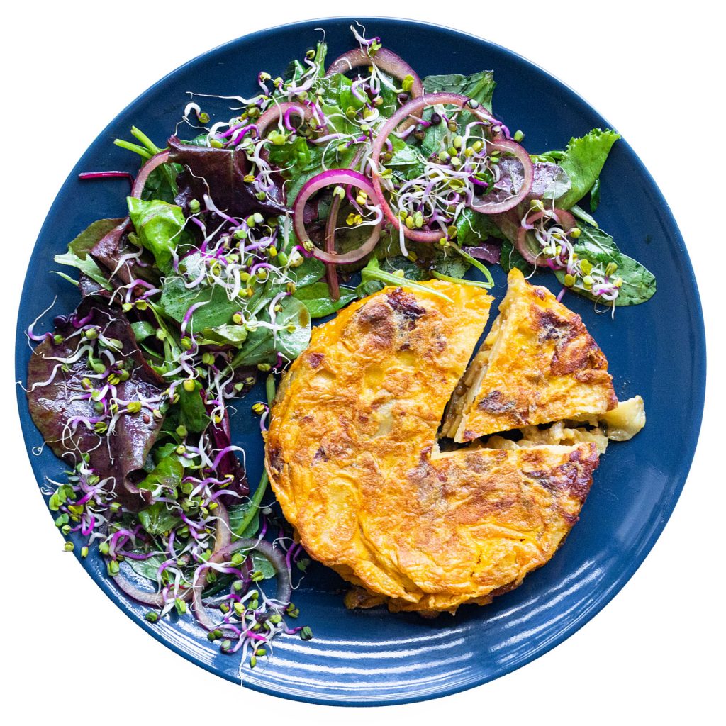 Pon la misma sartén a fuego medio con 1 Tbsp aceite de oliva y añade la mezcla. Cocina durante 3-4 minutos por cada lado o hasta que esté en el punto de cuajado que más te guste.