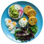 Unta el agucate sobre las tortitas y coloca encima el queso + el huevo + los rabanitos. Decora con el cilantro.