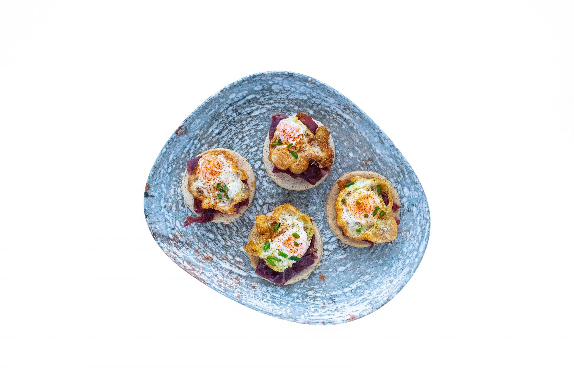 Reparte la cecina sobre las tostas y coloca encima el huevo.