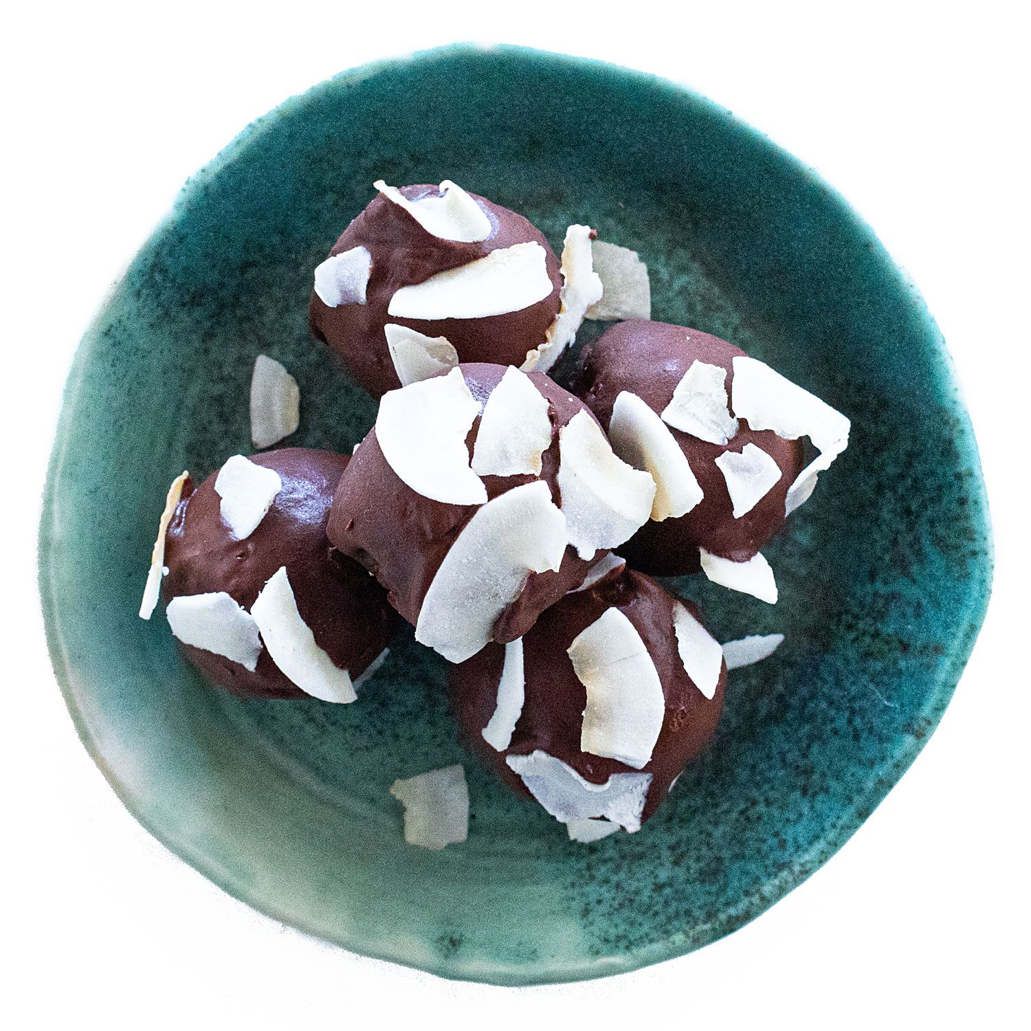 Haz bolitas del tamaño de una nuez y coloca en el plato. Si la masa está muy aceitosa y te cuesta trabajarla, añade un poco más de harina de coco.