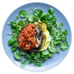 Monta el tumbet en una fuente. Coloca ⅓ de las patatas en la base, a continuación el calabacín y por último la berenjena. Cubre con la salsa de tomate.