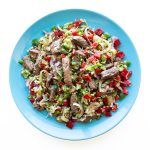 Mezcla en un bol la ternera con verduras + el brócoli + todos los ingredientes de la guarnición. Sirve.