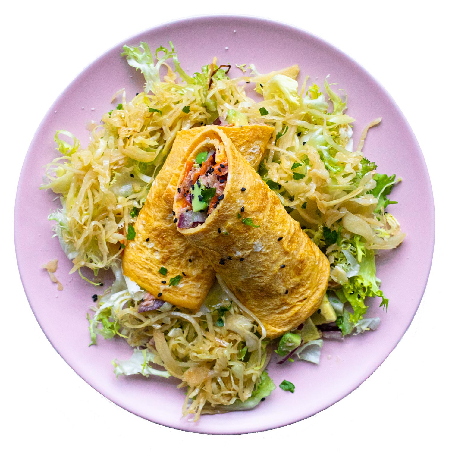 Añade la mitad del huevo a la sartén y gira con movimientos circulares hasta cubrir toda la superficie (como si hicieras un crepe) y cocina durante 2-3 minutos. Da la vuelta y cocina 1 minuto más.